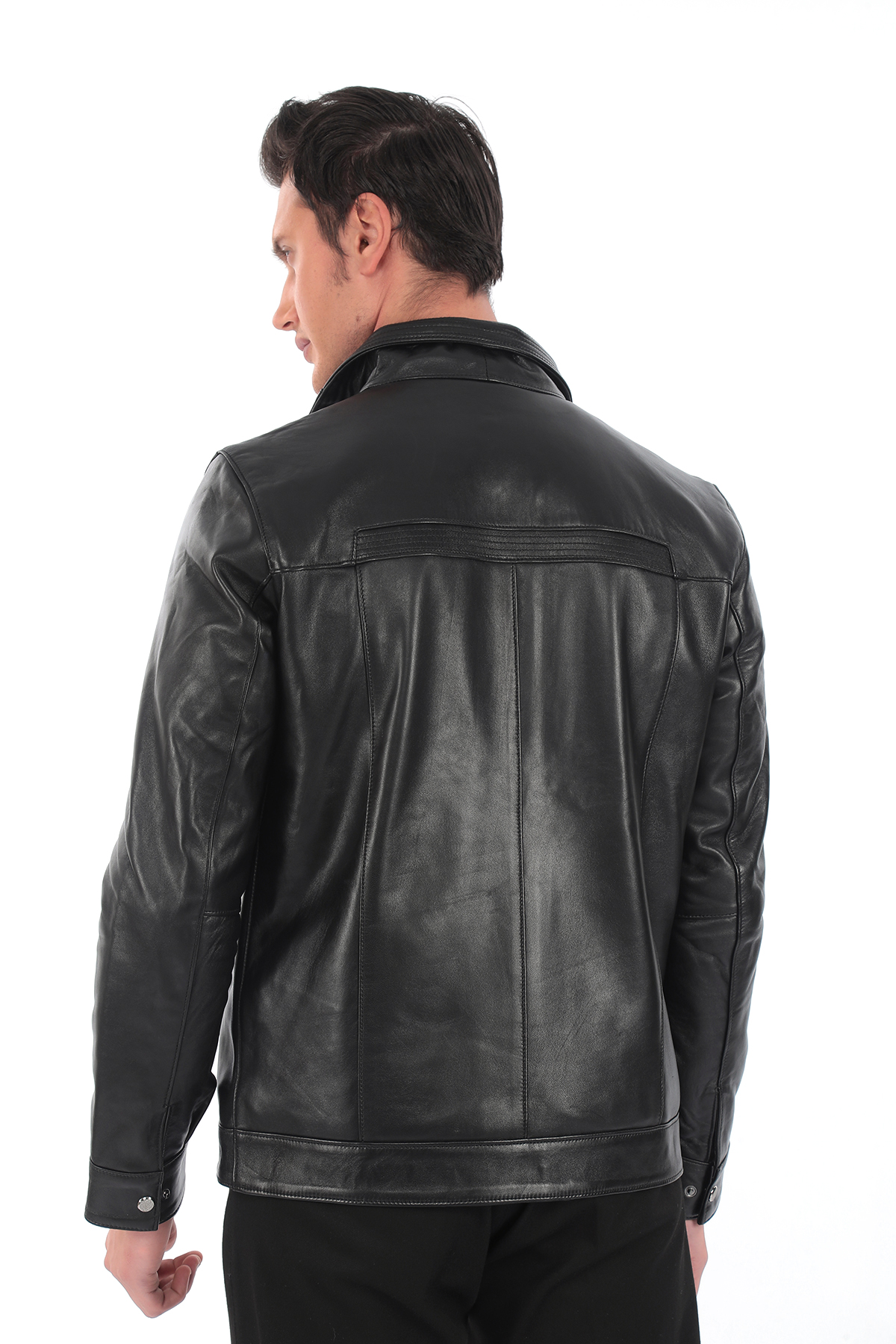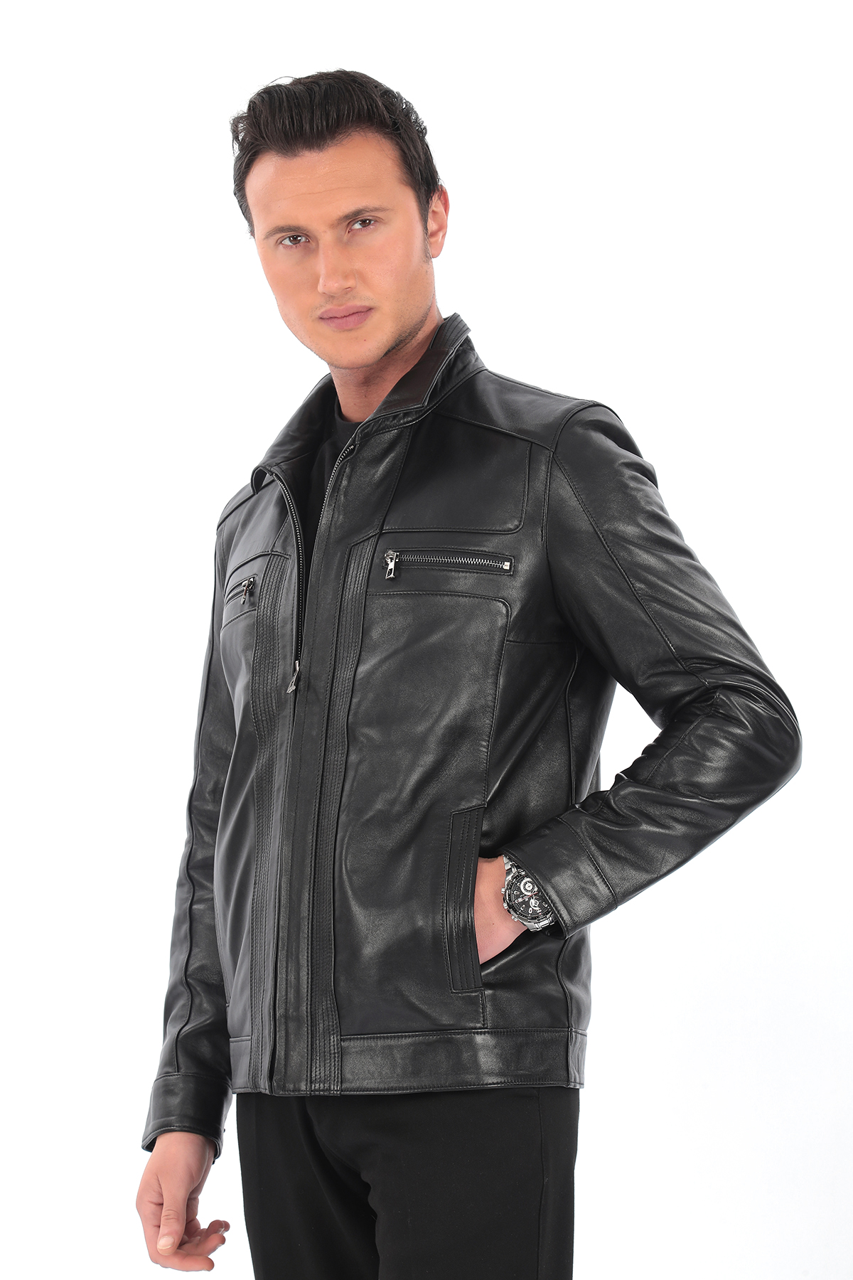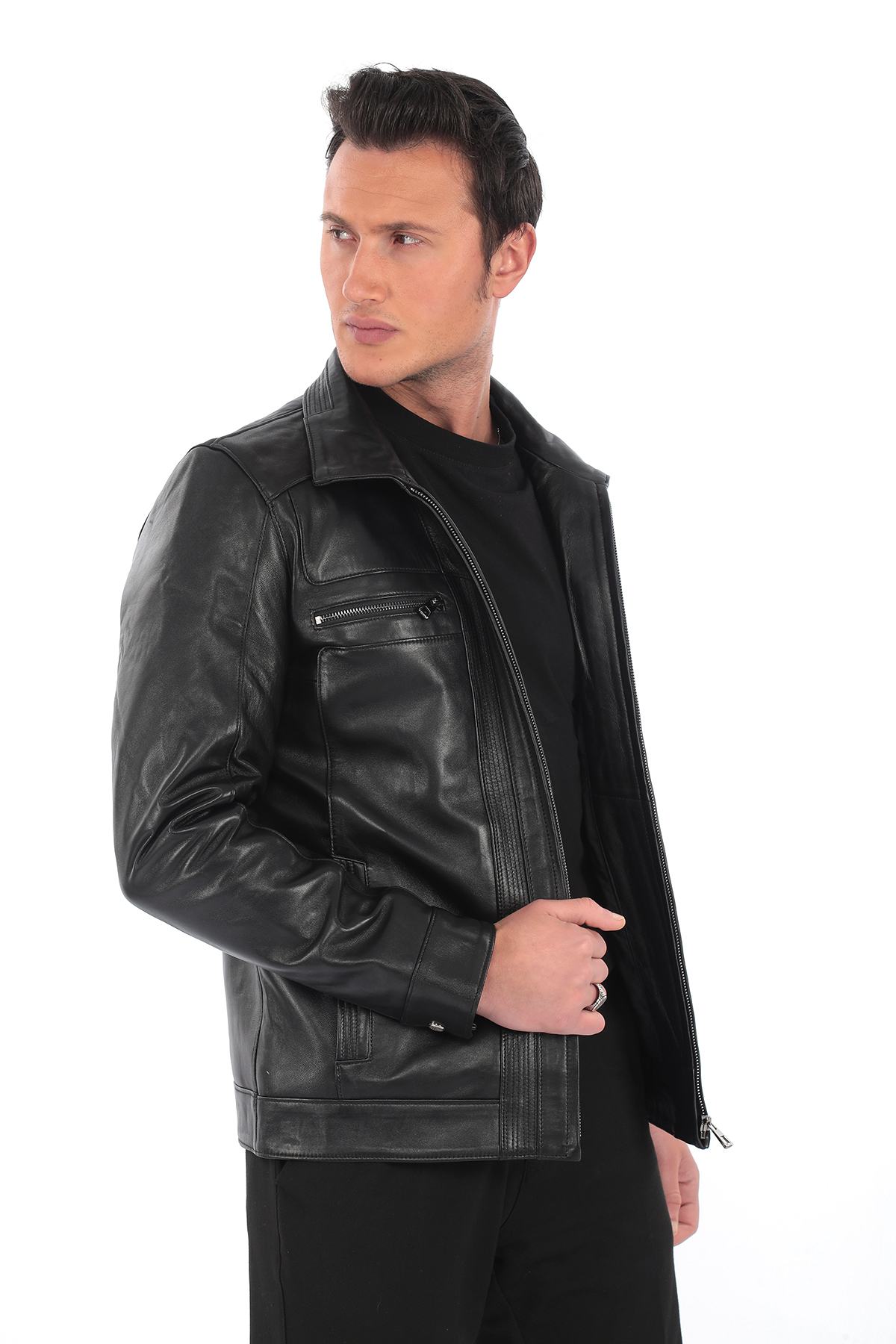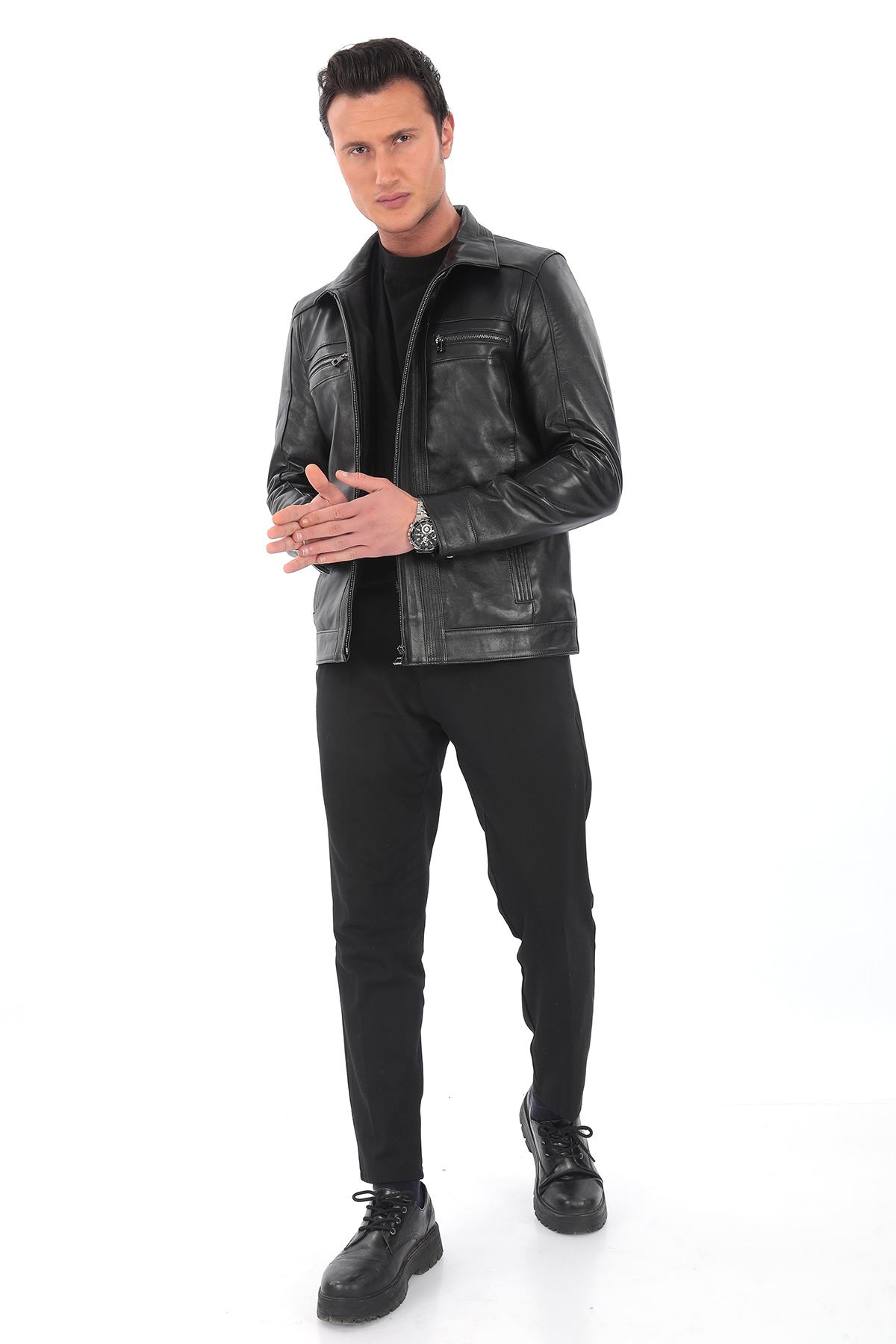 Erkek giyiminin vazgeçilmez parçası olan siyah deri ceket, bu modelde hem klasik hem de modern çizgileri bir araya getiriyor. Hakiki kuzu derisinden üretilen bu ceket, kaliteli dikiş detayları ve fermuarlı cepleriyle şıklığı fonksiyonellikle buluşturuyor. Şehir hayatının temposuna uyum sağlayan bu ceket, özel dik yaka tasarımı ve rahat kalıbı ile dikkat çeker.