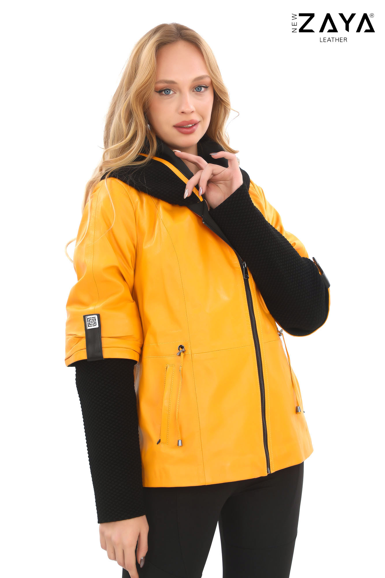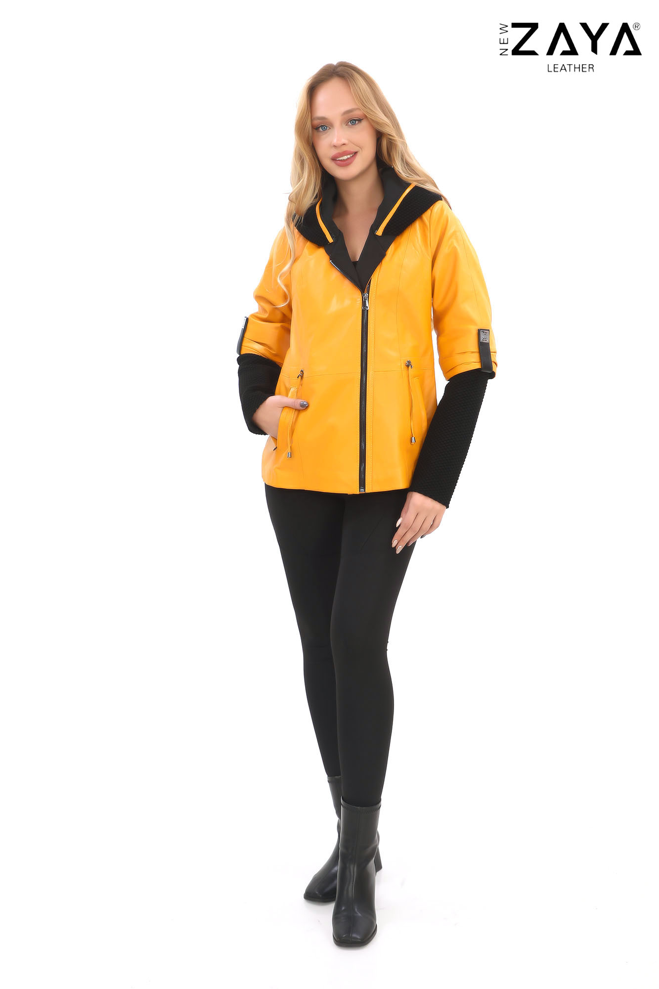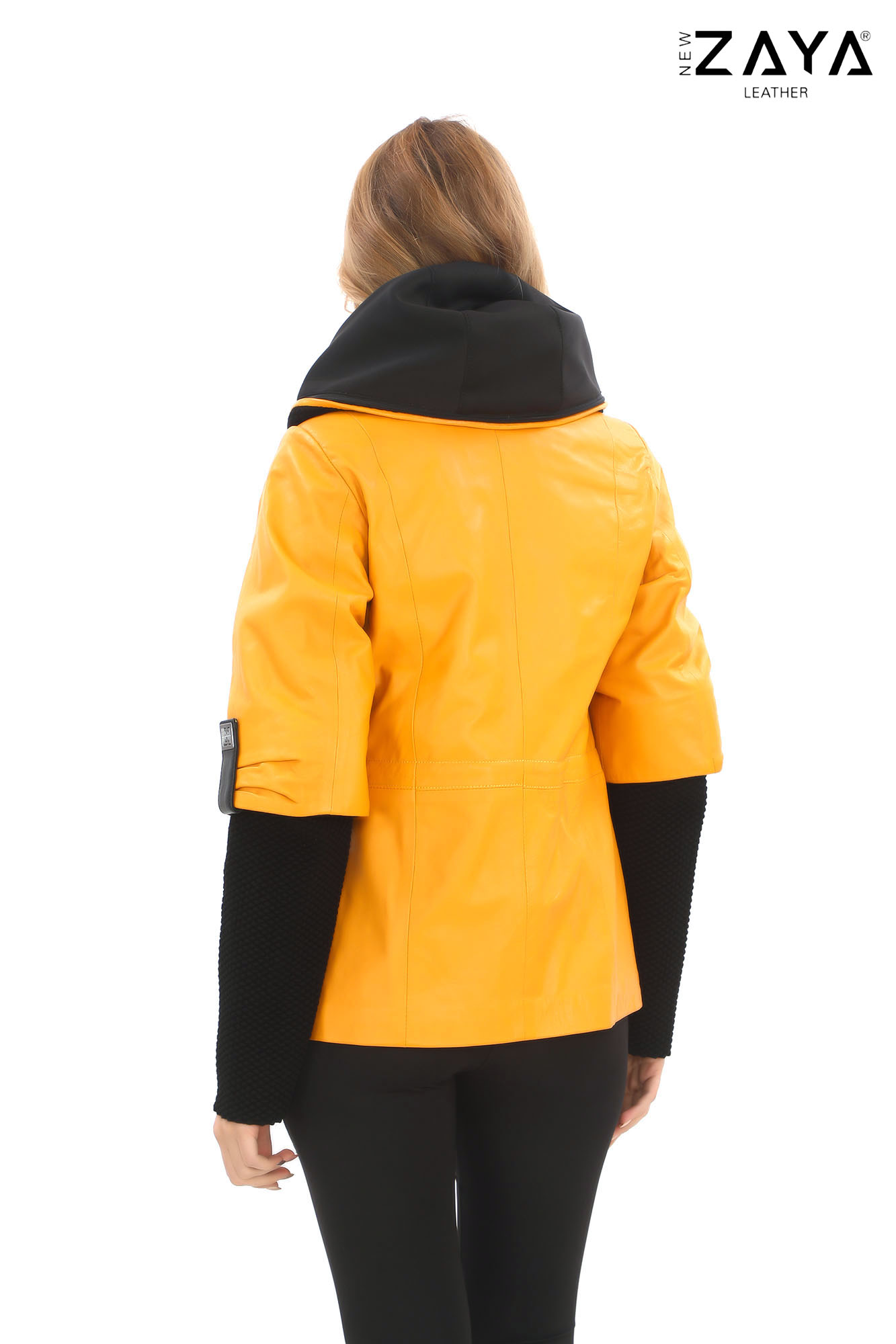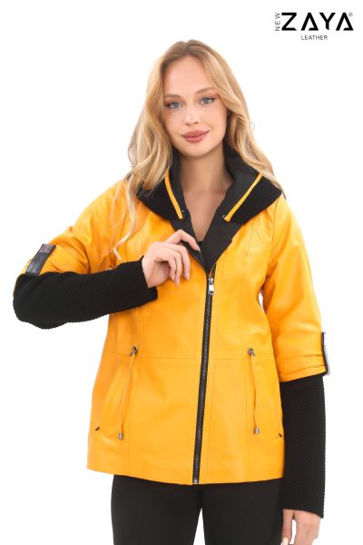 Şehirli kadın stilinin modern temsilcisi olan bu özel tasarım deri ceket, fonksiyonel ve şık detayları bir araya getiriyor. Hakim yaka formu, örgü dokulu kollar ve geniş kapüşonuyla dikkat çekerken, hem kapüşon hem de triko kol içlikleri çıkarılabilir yapıdadır.