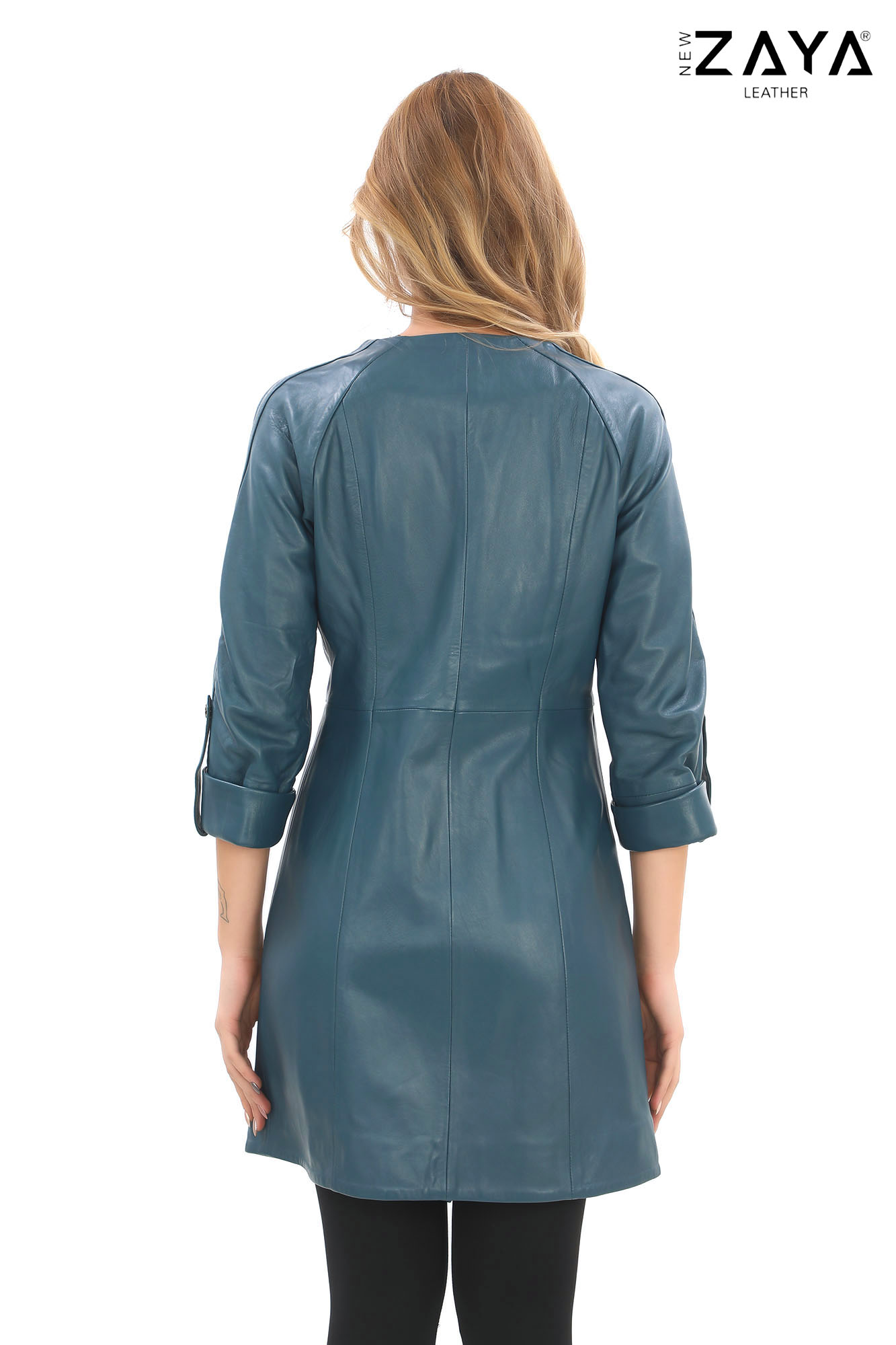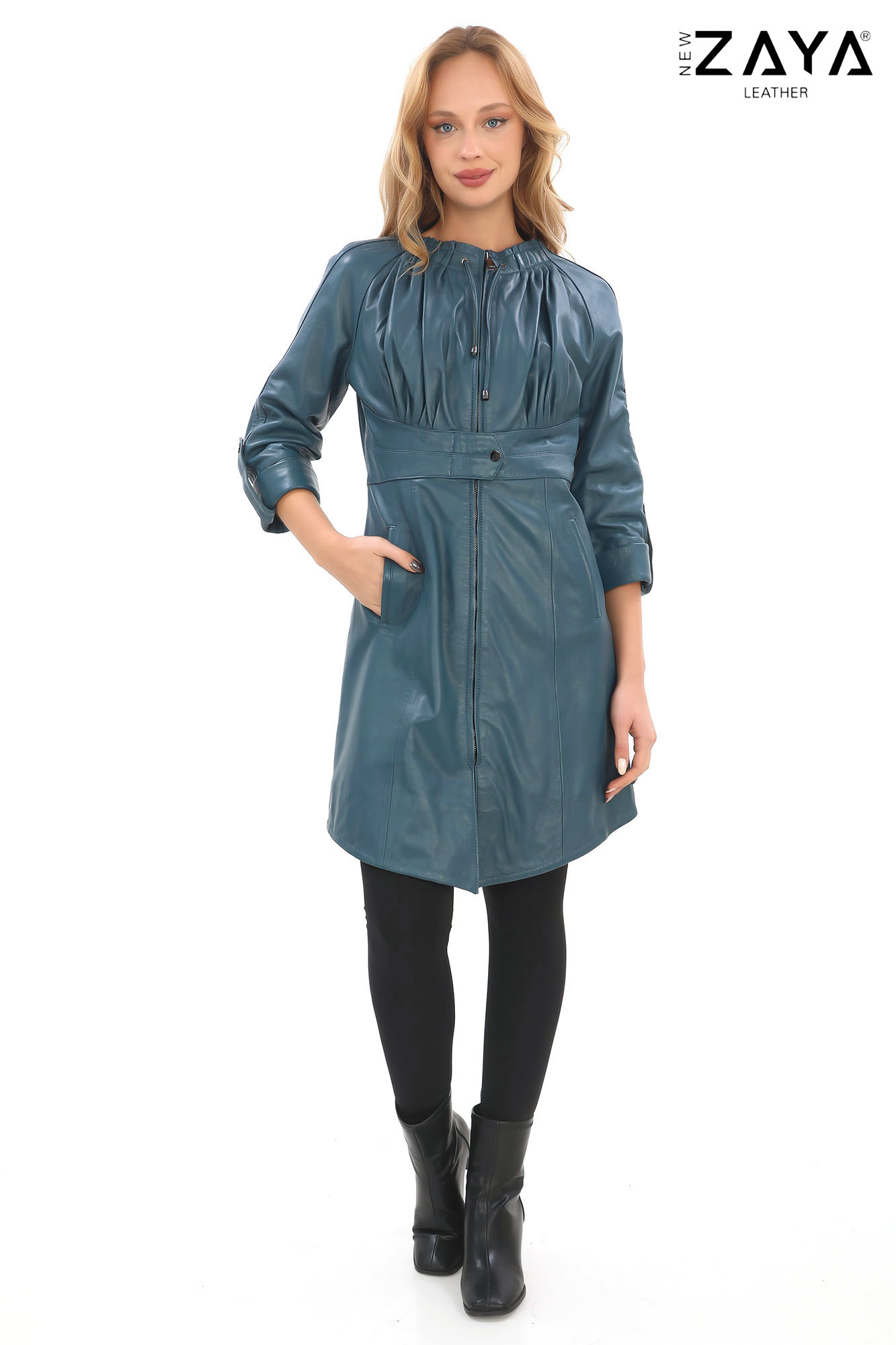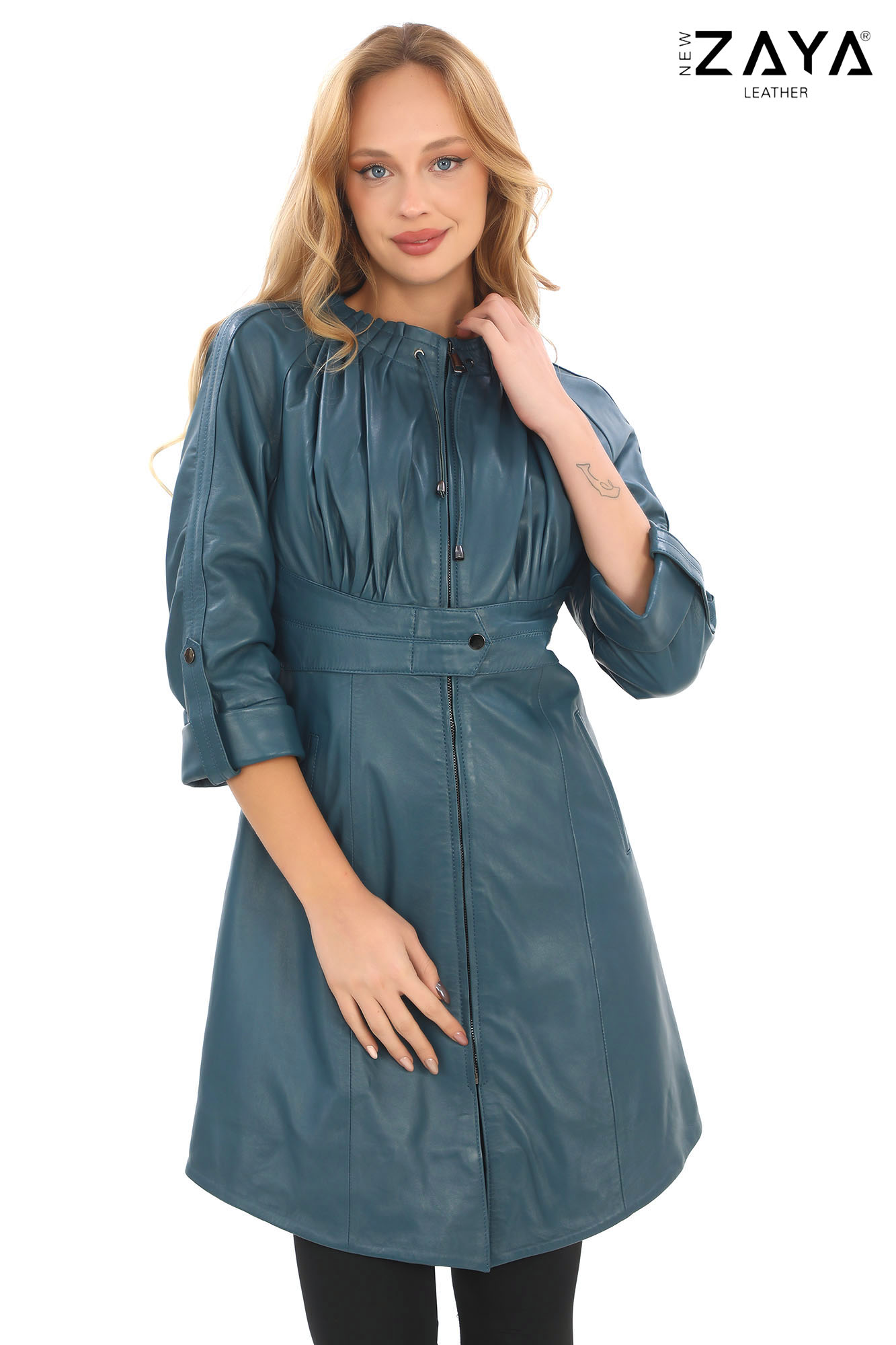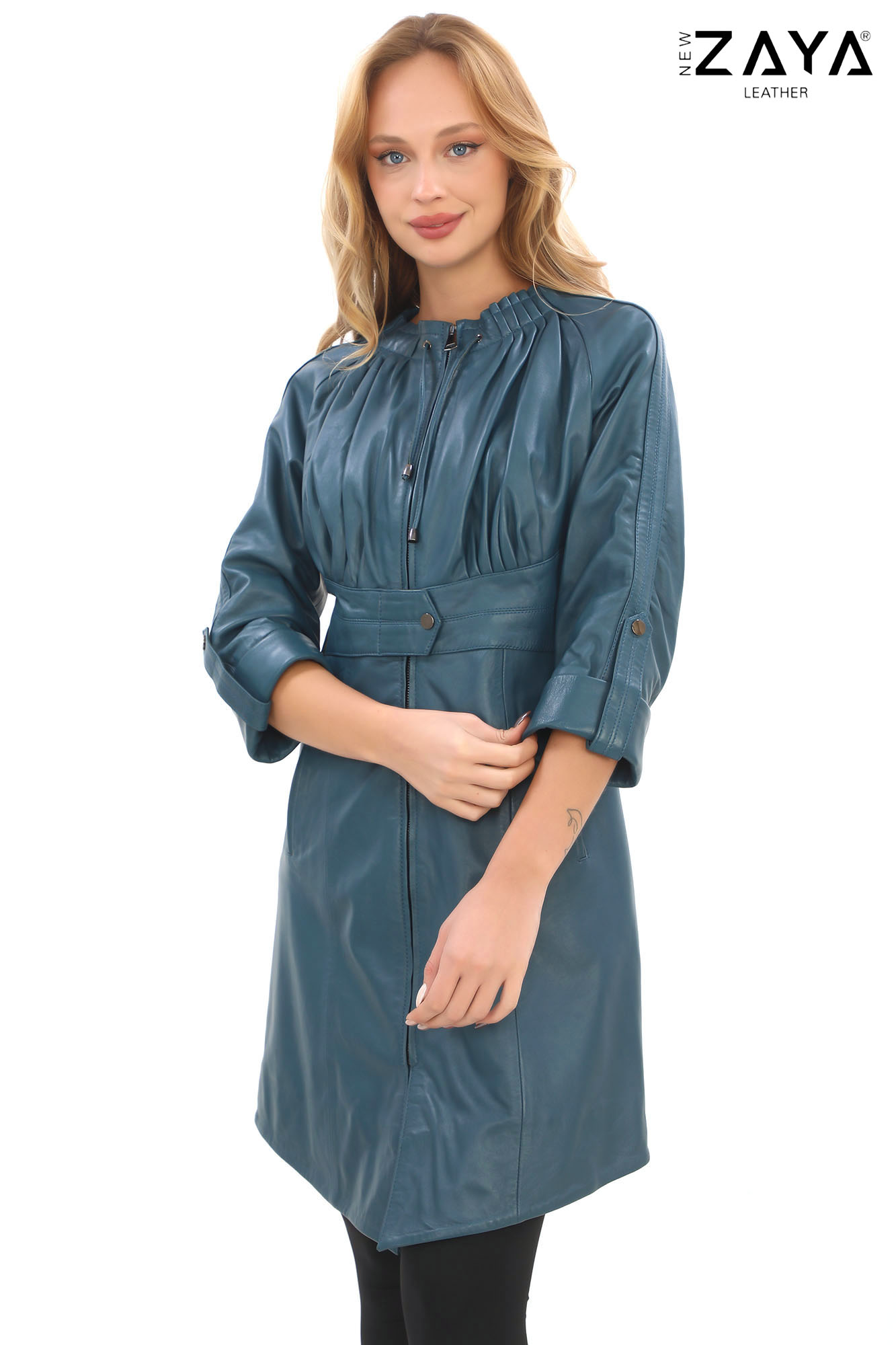 Modern ve feminen çizgileri bir arada sunan bu özel tasarım deri ceket, göğüs bölümündeki pileli yapısı ve bele oturan kuşak detayıyla zarif bir görünüm sunar.