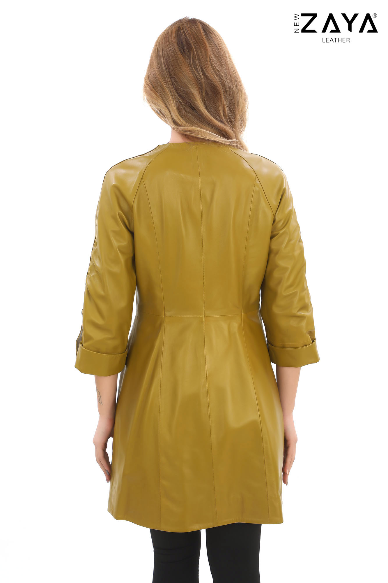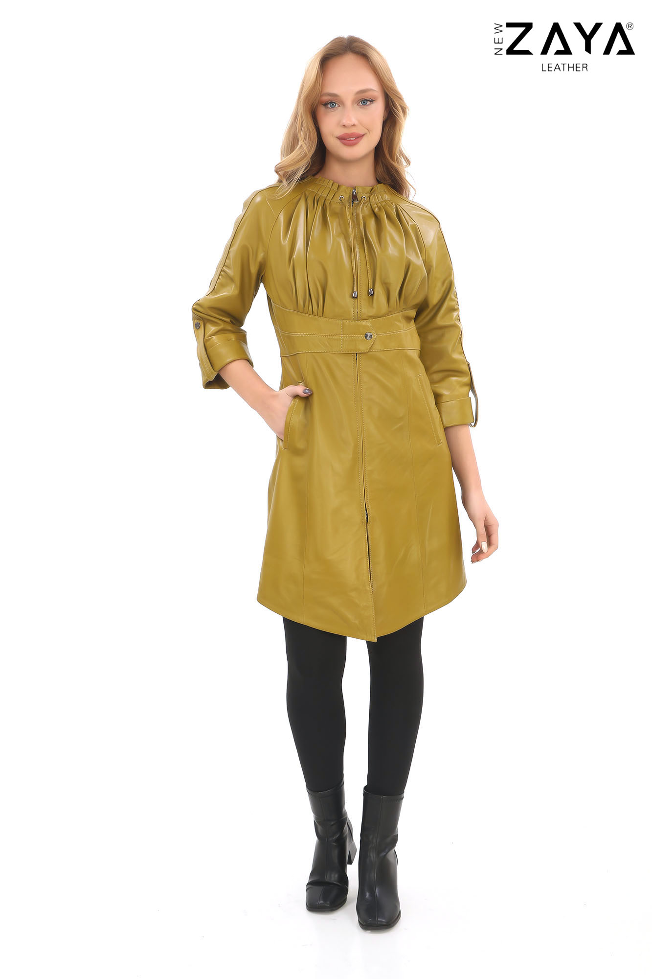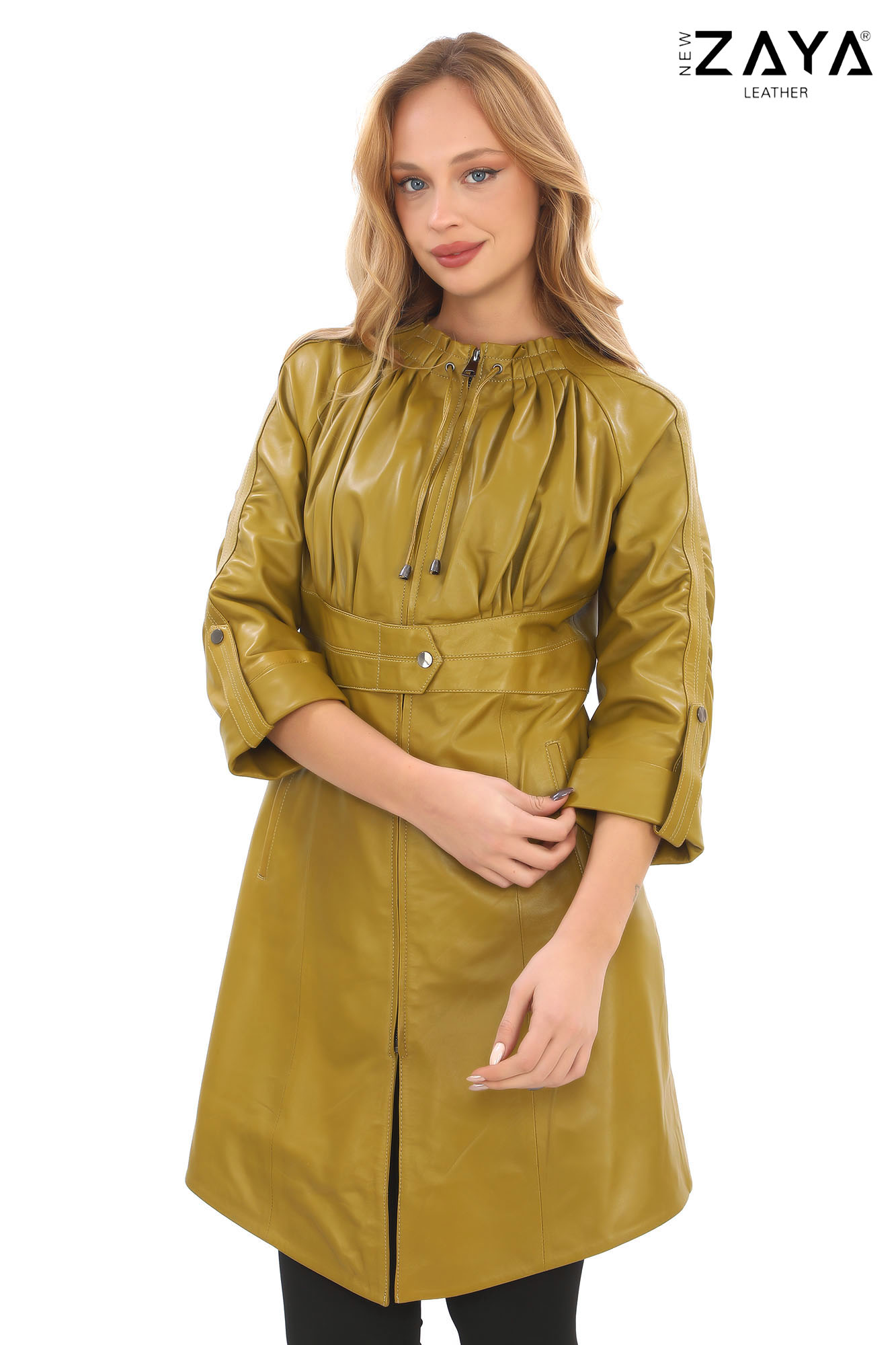 Göz alıcı detaylarıyla dikkat çeken bu kadın deri ceket, pileli yakası ve bele oturan kuşak detayıyla zarafeti modern bir çizgiyle buluşturuyor. Ayarlanabilir manşetli yarım kolları ve fermuarlı kapama sistemiyle hem şık hem de fonksiyonel bir kullanım sunar. Günlük kombinlerinize sofistike bir dokunuş eklemek isteyen kadınlar için özel olarak tasarlanmıştır.