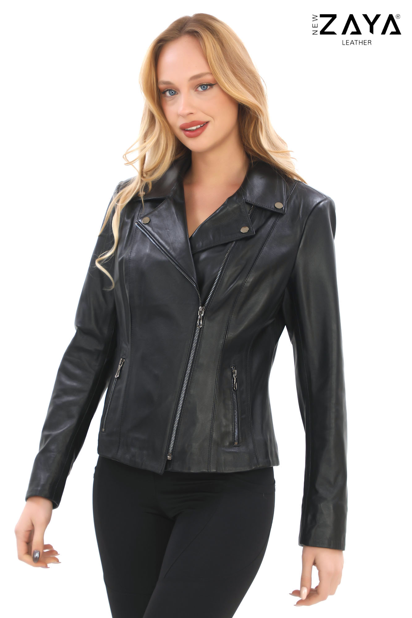 Kadın Siyah Deri Biker Ceket – Asimetrik Fermuar ve Geniş Yaka