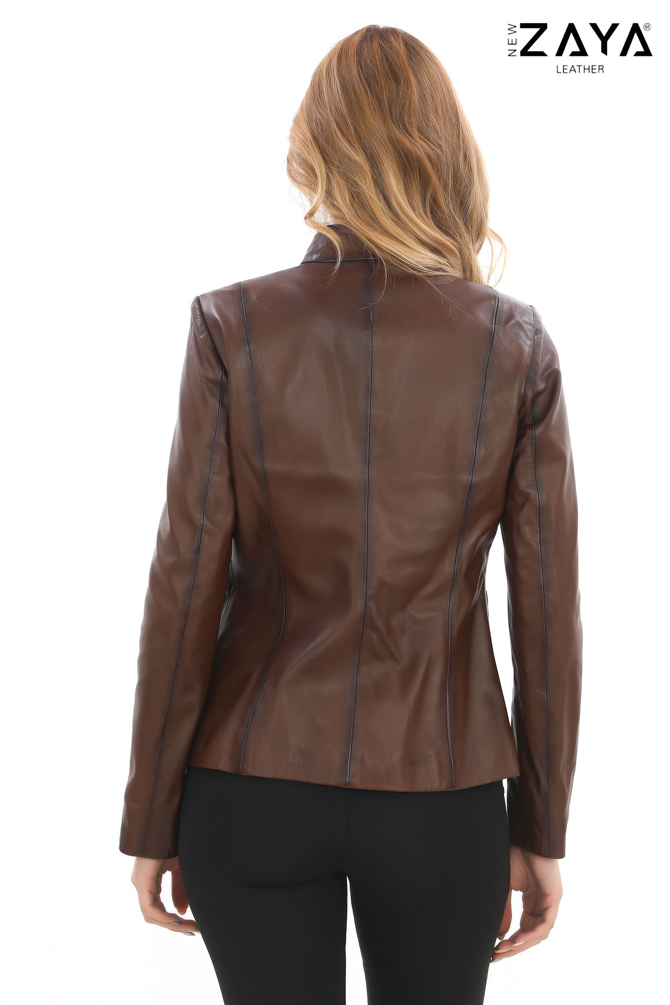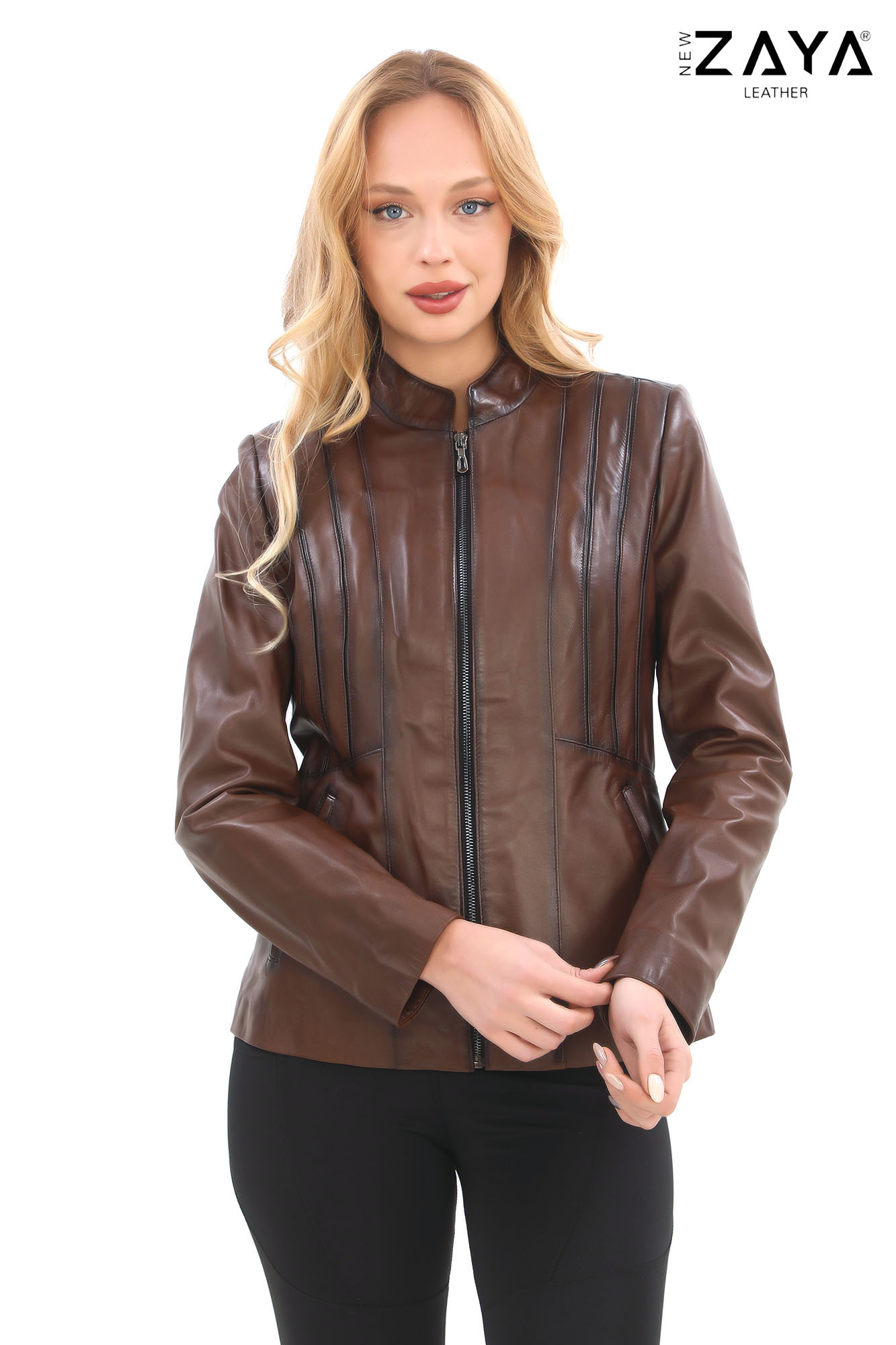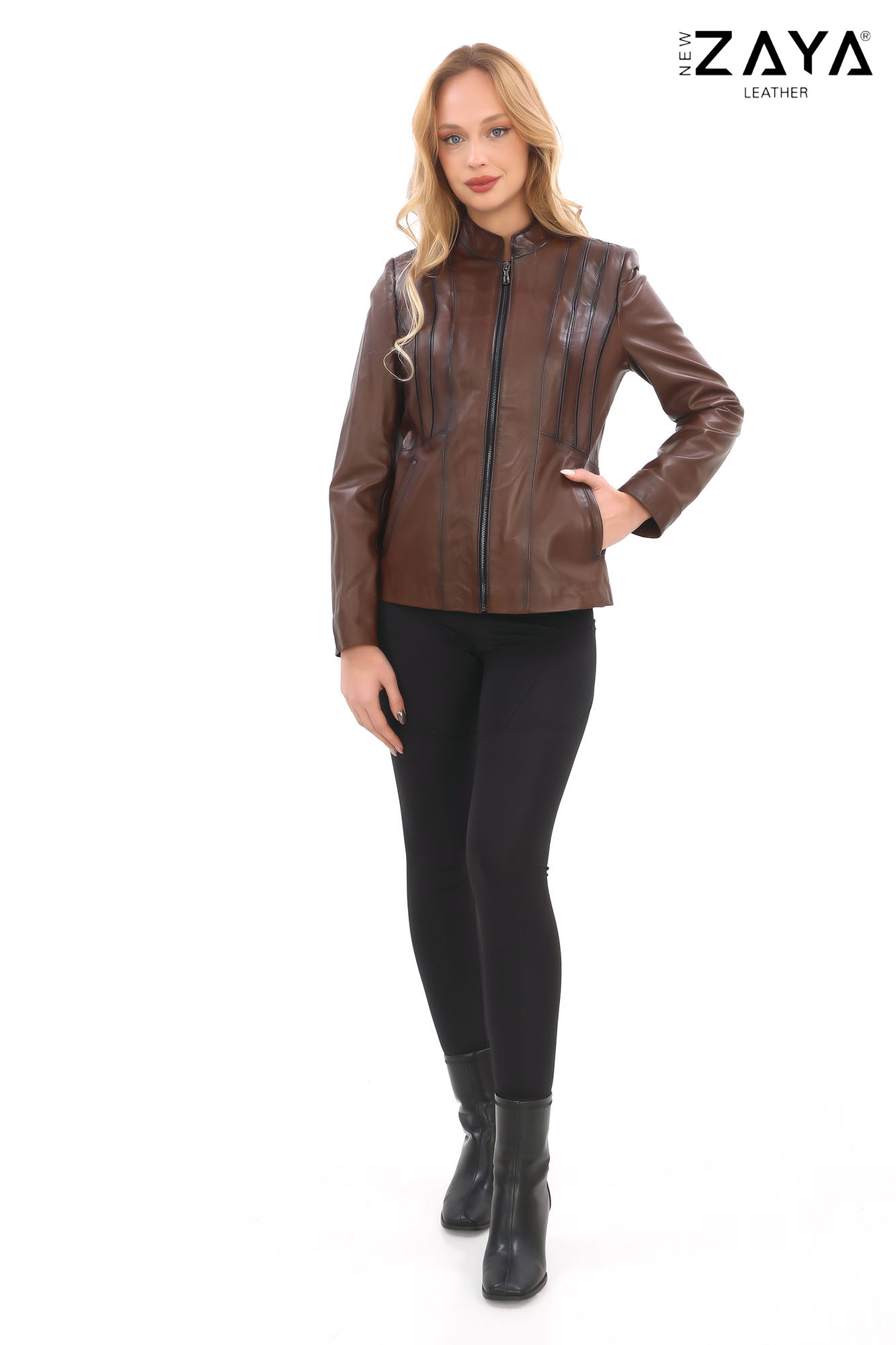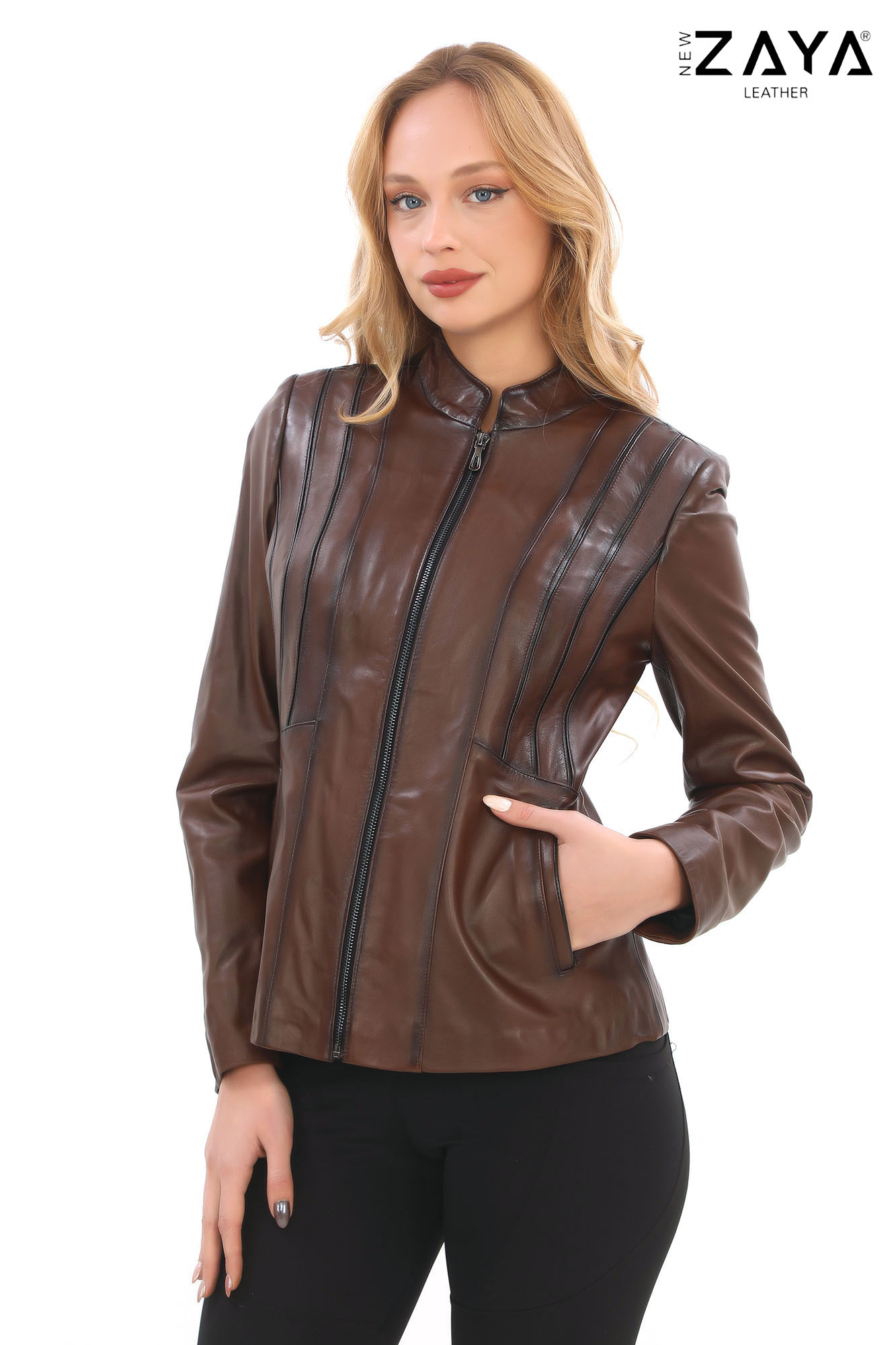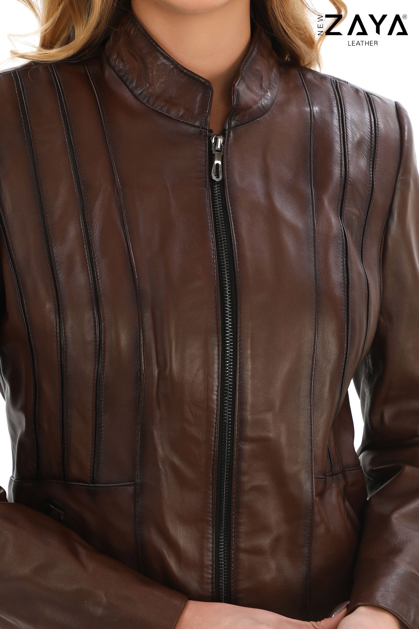 Kahverengi ve siyah çizgilerin asil uyumuyla tasarlanmış bu gerçek deri ceket, vücuda oturan formu ve dik yaka stiliyle sofistike bir silüet yaratıyor. Hem gündüz şıklığında hem akşam stilinde öne çıkar.
