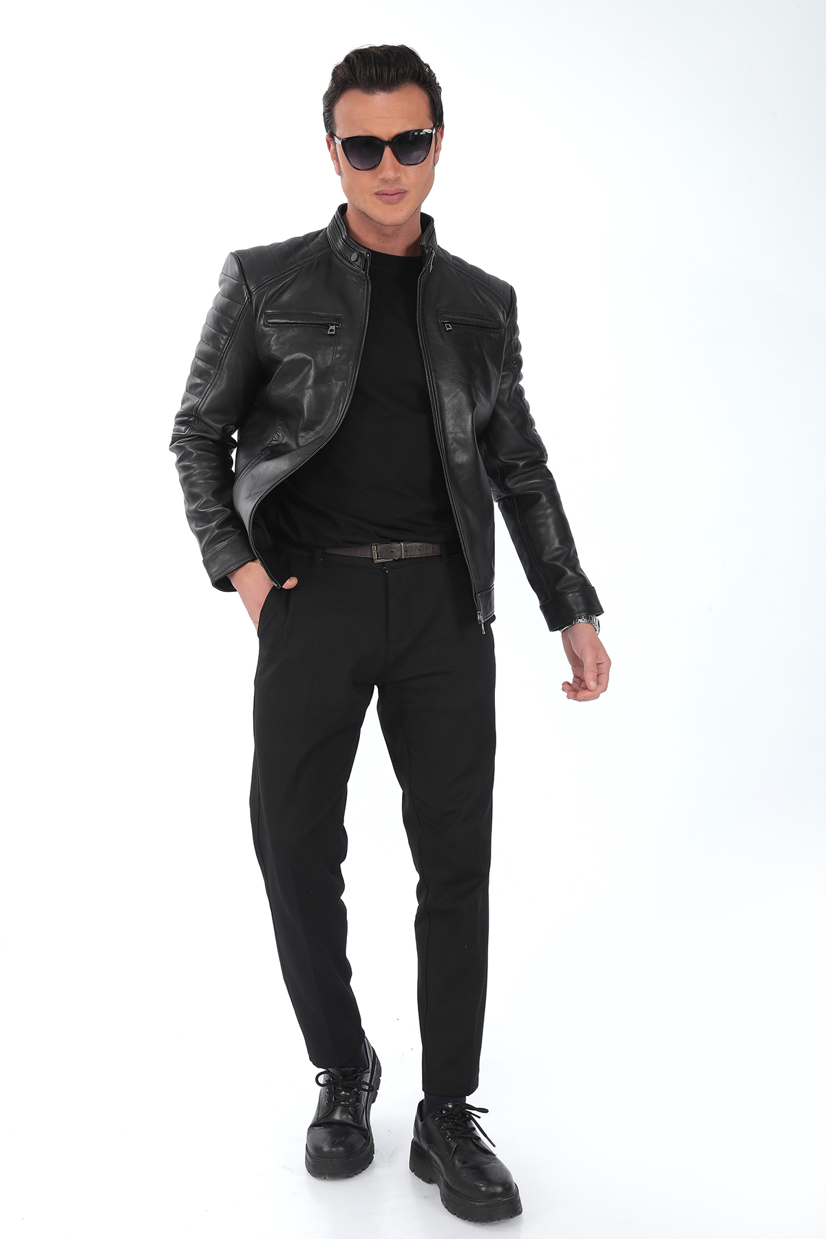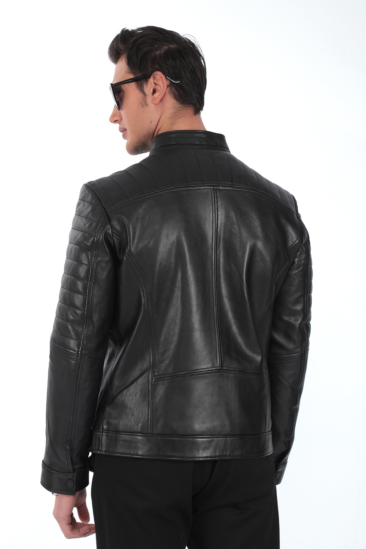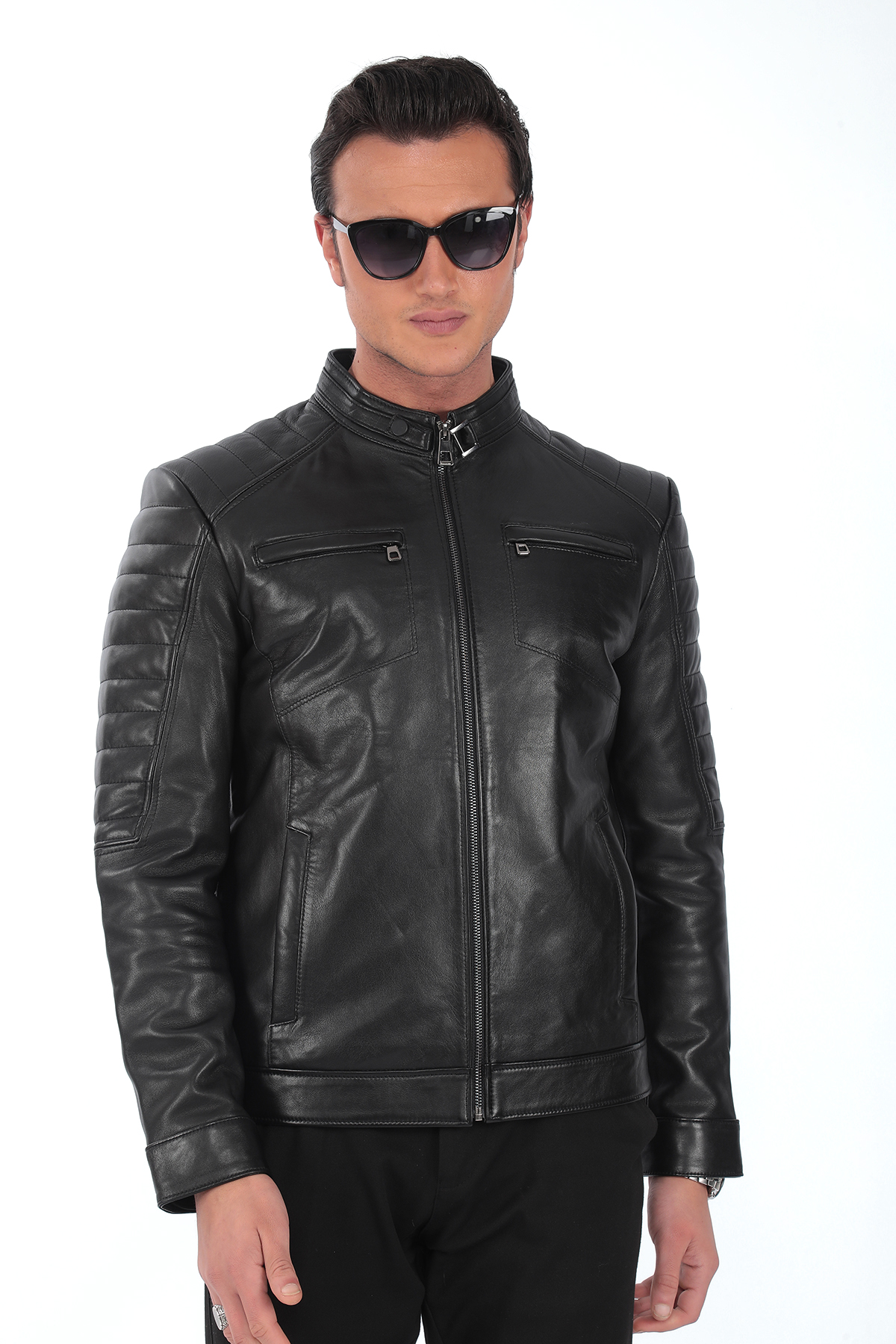 Cesur ve karizmatik bir duruşa sahip bu siyah erkek deri ceket, omuzlardaki yatay dikiş detayları ve slim-fit kalıbı ile dikkat çeker. %100 hakiki kuzu derisinden üretilmiş olup, hem spor hem klasik tarzlara kolayca uyum sağlar. İki adet göğüs cebi, iki yan cep ve çıtçıtlı yakasıyla hem şıklık hem de fonksiyonellik sunar. Motorcu stilini sevenler için mükemmel bir tercih.